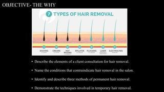 Hair Removal Chapter 11 Pivot Point Esthetics. Lecture and Power Point slides. Name the conditions that contraindicate hair removal in the salon.
